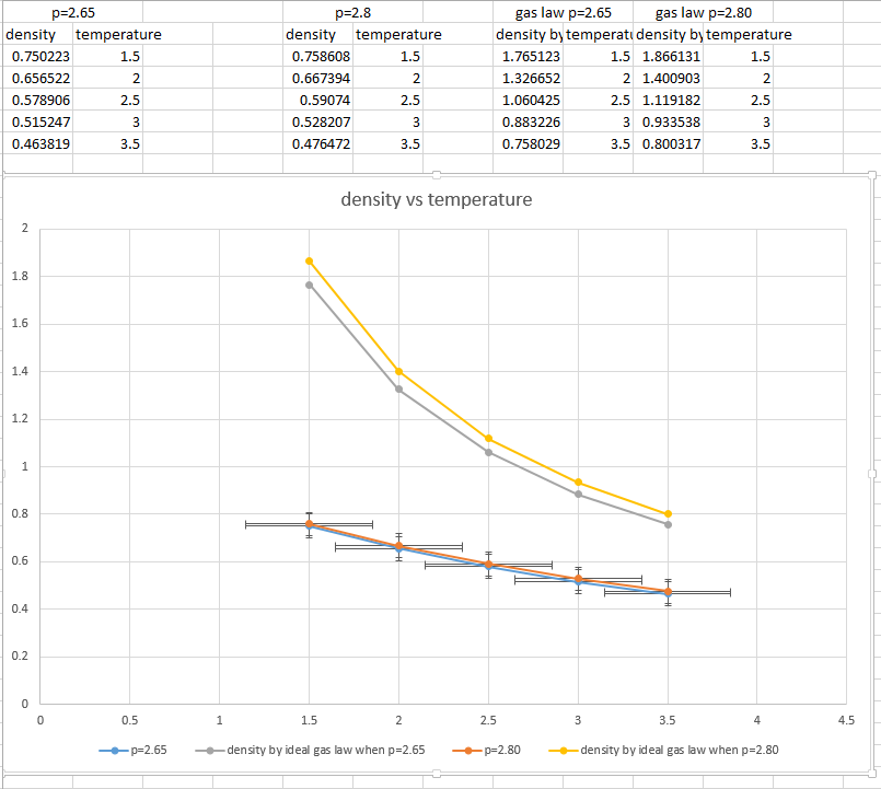 - plot of density vs temperature with error bars. a line corresponding to the density predicted by the ideal law.