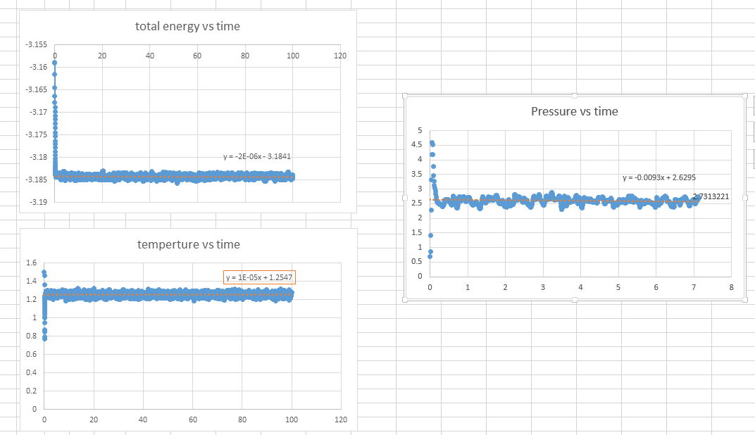 - plots of energy, temperature and pressure against time. equilibrium(how long to reach). plot of energy vs time. find a good timestep.