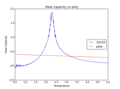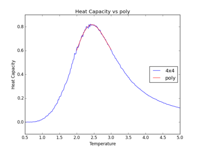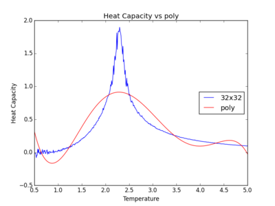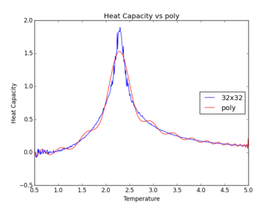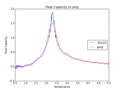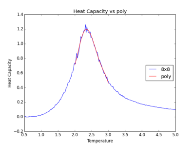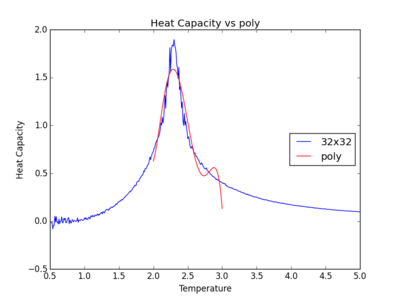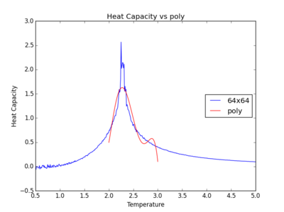 It can be observed that the polynomials fit the peaks better when only subjected to this temperature range spanning the peak region. However, as the lattice size gets larger, the peak becomes sharper. For an infinite lattice, the peak actually diverges at T = TC, so the polynomial for the larger 32x32 and 64x64 lattices do not fit as well.