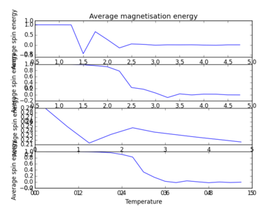 The energy per spin was plotted versus temperature. As can be seen, the error in average energy per spin decreases with system size. However, the average magnetisation error stays roughly constant. As the temperature increases, the average energy per spin of the lattice system increases. A concurrent drop in magnetisation also occurs as the temperature is increased. This is suggestive of a phase transition. Spontaneous magnetisation occurs after a cutoff temperature. This temperature value is critical, and determines whether a material will show ferromagnetic behaviour. Looking at these plots, as the temperature of the system increases past this critical temperature, average magnetisation drops as average energy increases and spins become aligned in its ground state form[2].