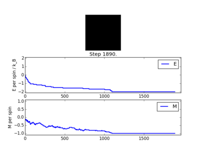The figures above show the Monte Carlo simulation results. These show the energy per spin over a number of steps that have passed. they show that over an elapsed period of steps, the spin state tends towards -1 or +1. This alignment of spin states is confirmed by the top graphs (energy against steps) which shows the energy tending towards -2kb, ie, reducing to ground state.