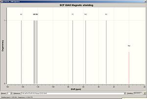 In this reaction, two different regioisomers are formed and can be separated by spectroscopic methods such as 13C NMR. Computational methods will be used to predict the 13C NMR and results will be comapred to literature reports. 1 H NMR will also be predicted along with IR spectroscopy data. The energy of both isomers were minimized using MM2, resulting in isomer B being optimized to an energy slightly more than that of isomer A (6.0034 kcal/mol vs. 6.6361 kcal/mol). Both of these isoemrs were then geometrically optimized using DFT = MPW1PW91 with a basis set of 6-31G(d,p). The geometrically optimized structures were then submitted for NMR prediction, with CDCL3 as solvent, with the results and analysis shown below. The NMR spectra are referenced to TMS MPW1PW91/6-31G(d,p) CDCl3 GIAO. It must be noted that carbons attached to heavy elements must have their shifts corrected. In the product isomers, a C-Br bond is present which is corrected accordingly by -12ppm to allow for spin-orbit coupling errors.