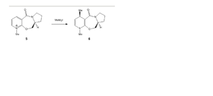 Image 6 shows the reaction scheme whereby the optically active derivative of prolinol (5) which reacts with methyl magnesium iodide. This results in the alkylation of the pyridine ring at the 4-position, with the absolute stereochemistry shown in reactant 6, image 6.