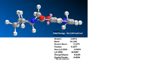 The same energy minimisation process was repeated on reactant 5 using the MMFF94 minimisation method. The total energy value obtained was 57.4335 kcal/mol. The reason for this significant total energy difference could be due to the different force fields parameters used. It is not possible to compare the total energies of a molecule using different force fields.