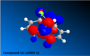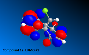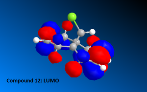 To evaluate which of the two alkenes is subject to electrophilic attack we must focus on the HOMO diagram of compound 12. This shows that the electron density cloud over the alkene syn to the chlorine atom on the bridging cyclopropyl ring is greater in size compared to the anti alkene. Thus it is possible to conclude that the syn alkene is more susceptible to electrohpilic attack. Literature studies also confirm this conclusion , see image: Literature Calculated PM3 HOMO compound 12.