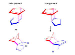 Frontier orbital interaction theory can be used to explain why the endo transition state has a relatively lower energy than the exo transition state. When two cyclopentadiene molecules come together the symmetry of the reacting alkene orbitals is correct for bond formation. In addition, at the back of the diene the symmetry of the orbitals is appropriate for bonding interactions to exist across the ‘space between orbitals’. Although these interactions do not lead to the formal bonds, the stereochemistry of the dimer is adjusted so that the favourable interactions can exist. This specific type of favourable orbital interaction is referred to as secondary orbital overlap (SOO). SSO is defined as the positive overlap of a nonactive frame in the frontier molecular orbitals of a pericyclic reaction.4
