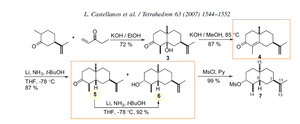 The Birch reduction of unsaturated cyclic ketone 4 using t-BuOH leads to the alcohol 6 in 87 % yield and the ketone 5 in a ratio 10:1 and further conversion of 5 into 6 was resulted in 92% yield using a Birch reduction under the same conditions: Li, NH3, t-BuOH, THF, -78 °C.