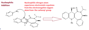 The mechanism of reaction 2 is a SN2 type nucleophillic addition reaction, occurring at carbon 4 of the aromatic ring. The carbonyl oxygen is relatively bulky thus the PHNH2 group is more likely to attack from the opposite site to the carbonyl oxygen. The carbonyl oxygen faces downwards relative to the aromatic ring, see image 15, hence the PHNH2 group will attack from the top face. Also the PHNH2 group cannot form any favourable interactions with the electronegative oxygen atom since the nitrogen and the phenyl rings are electronegative and electron rich respectively thus only unfavourable repulsive forces may be present.