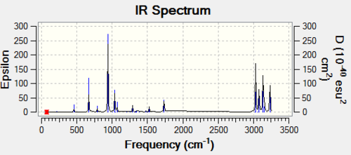 A minimum can be calculated but so can a transition state, in order to determine what has been calculated, it is important to look at the IR spectrum. The IR spectrum is shown below in order to check that a minimum was in fact calculated and vibrations are correct: