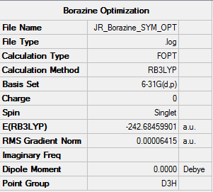 The Method used for the optimisation of Borazine is RB3LYP and the basis set used is 6-31G(d,p).