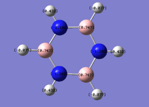 The borazine NBO analysis shows that there is a high distribution of charge with the highly electronegative nitrogen, Mulliken electronegativity 3.04, compared with the electropositive boron, Mulliken electronegative 2.04, giving a polar bond which results in borazine having an alternating charge distribution (N=-1.102, B= 0.747) in the inner ring. This makes the ring susceptible to electrophilic attack at the nitrogen and nucleophilic attack at the boron on the ring. Due to the differing electronegativities of the inner ring substituent atoms, two hydrogen charge environments are produced. Hydrogen has a Mulliken electronegativity of 2.2 [2]and therefore is more electronegative than boron, giving each hydrogen bonded to a boron a charge of -0.077, whilst nitrogen is more electronegative than hydrogen resulting in nitrogen bound hydrogens a charge of 0.432.
