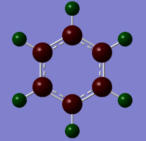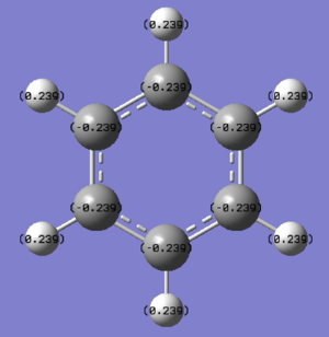 The benzene charge distribution shows a symmetrical arrangement of the charge with the more electronegative carbon, Mulliken electronegativity 2.55, having a charge of -0.239 and the more electropositive hydrogen, Mulliken electronegativity 2.2, having a charge of 0.239. Compared with borazine, there is a relatively low charge distribution in benzene due to the lower polarity between carbon and hydrogen. Each carbon and each hydrogen has the same partial charge, creating a negatively inner ring which is susceptible to electrophilic attack.