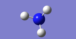 For NH3 molecule, 6 vibration modes are expected. In these 6 modes, mode1, mode2 and mode3 are banding vibrations while the rest 3 modes are stretching vibrations. Some modes have the special features, mode4 is highly symmetric, and mode1 is know as umbrella mode. Furthermore, some modes show similar energy levels, mode2 and mode3 are degenerate, mode5 and mode6 are degenerate. Four different energies are obtained from the vibration modes, therefore four bands are expected to be seen. However, in experiment only 3 peaks are observed in the spectra. The reason for this observation is due to only vibration that contains dipole can be detected. Among the four vibrations, mode4 doesn't have the dipole, then the peak is not shown on the spectra.