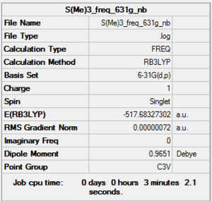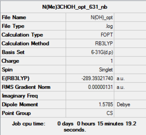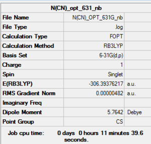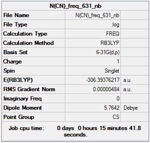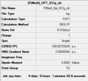 In the optimisation step, the minimum energy structures of the molecules are located on its potential energy surface or the moelcule transition structure.1 The additional keyword used in the method step were 'integral=grid=ultrafine scf=conver=9'. The same keyword will he used for the frequency step. All the molecules used in this part are neutral thus in the method section of the optimisation step, the charge is set at zero with multiplicity of a singlet because 2S+1= 1. This step is very important in the project section as the ionic liquid molecules that were analysed as all positively charged. The gradient of the optimised molecule should be close to zero, for the stationary point on the potential energy surface is zero.1 For the optimisation step, it is important to check whether the molecule we optimised has converged or not as shown later in the 'Optimisation summmary data' of the respective molecules. The details of the convergence criteria will not be discussed in this section. In the frequency step, we are confirming to have minimal structure deally, we would like all the frequency readings to be positive, but the program used is not perfect. Population analysis type that were used was the NBO population analysis.
