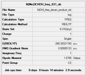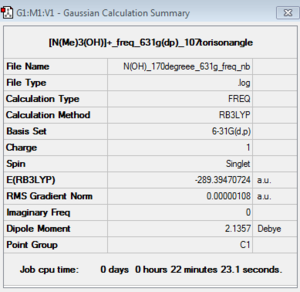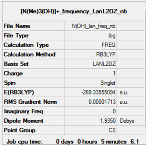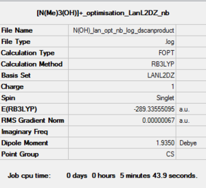As noted before using medium basis set, LanL2DZ for [N(CH3)3(CH2OH)]+ gave a good low frequency but it is not accurate. LanL2DZ i.e Pseudo-potential should only be used on heavy atoms, row threee Therefore the result that were obtained using LanL2DZ will not be used.