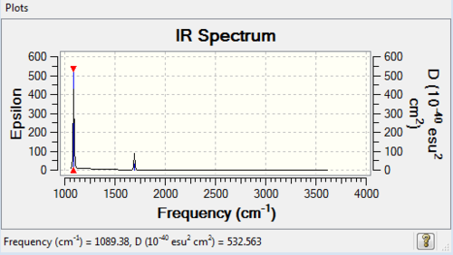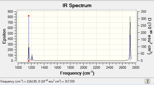 In the frequency row, the frequency of the umbrella motion is highlighted in blue as shown. For the modes of GaBr3 and BH3 molecules, the frequencies of the modes decreases down the column of the modes. Between these two molecules, the umbrella motion is an interesting part to discuss. As shown in the 'displacement vector' row of the table above, different atoms are doing the displacement. For the heavy molecule, GaBr3 the Ga atoms were the one that is doing the displacement. This is due to the fact that Br atom are slightly heavier than Ga atom. For BH3, the H atoms were the one doing the displacement as it is obviously lighter in mass in comparison to B atom. It is deduced then that for the umbrella motion, the lighter atom relative to the other atoms in the molecules will do the displacement. The arrangement of the modes between the two molecules were almost similar but the frequecy of the respective molecule's umbrella motion the focus of this discussion. Both the frequency and the intensity of this vibration varied greatly between these molecules. The frequency of these vibrational motion is proportional to the bond strength and inversely proportional to the mass of the molecule as shown by the Simple Harmonic Motion formula. Therefore since the mass of the GaBr3 molecule is heavier in total in comparison to BH3 molecule, the frequency is thus lower for the umbrella motion of the GaBr3 molecule when compared with BH3 molecule. The bond length of Ga-Br is 2.26 Å while for B-H it is 1.19 Å, therefore the longer the bond, the weaker the strength of the bond as evident by the dissociation energy of the bond.
