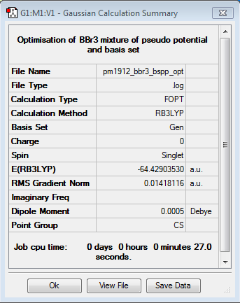 The vibrational frequencies of BH3 are much larger than that of GaBr3 and its IR spectrum is focused around wavenumbers in the 1000 – 3000 cm-1 while that of GaBr3 is below 350 cm-1. This large difference indicates that the bonds in BH3 have a much higher energy than the GaBr3 bonds so are therefore stronger. This analysis is backed up by the previous optimisations where the bond lengths in BH3 are shown to be less than in GaBr3 as shorter bond lengths correspond to stronger bonds. Also heavier atoms vibrate less frequently than lighter atoms, this is why GaBr3 vibrates at such a lower frequency compared to BH3.