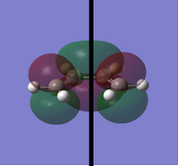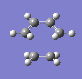 Before calculating the structures of the transition state of the [4+2] cycloaddition between 1, 3-butadiene and ethene, structures of both reactants were optimised to a minimum using Semi-Empirical AM1 and B3LYP/6-31G+, respectively. After obtaining the optimised reactant structures the symmetries of the HOMO and LUMO orbitals of each reactant with respect to a plane, defined by the black line drawn in the images below, were determined.
