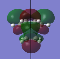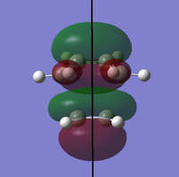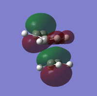 To determine whether the cycloaddition is allowed by the selection rules for pericyclic reactions the HOMO and LUMO of the transition state were generated. With respect to the plane defined by the black line in each image below the HOMO and the LUMO appear to be symmetric. Therefore, this HOMO appears to have been formed from the interaction of HOMO of ethene and LUMO of 1, 3-butadiene.
