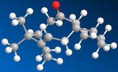The mechanism has a high degree of regio-stereoselectivity as the incoming MeMgI only attacks at the top face of the ring. The grignard will only add to the 4 position and the reaction proceeds via an electrostatic attraction between the Mg and O as represented by a dashed line in the mechanism above. After several attempts at optimization of Species 6 it can be concluded that the carbonyl group cannot be below the ring and is infact in the plane of the ring. The methyl group must add to the top face of the ring and point upwards. Although regio-stereoselectivity is already high, it could be increased by using a Grignard with a bulkier R group for e.g. -Ph.[2] Unfortunately the Mg component cannot be included in the MM2 Calculations as the calculation is built upon preset parameters for each atom which do not include parameters for Mg.