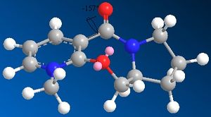 The minimum energy found for Species 5 using the MM2 Calculation is 39.1736kcal/mol while the final energy using the MMFF94 minimisation is 57.4888kcal/mol. Another conformer of higher energy [43.1293kcal/mol] of Species 5 is shown. The seven membered ring is quite rigid and it is therefore only the movement of the substituents which have any significant effect on the energy of the molecule but movement of the carbonyl group is restricted. However slight puckering of the 5 membered ring can occur.