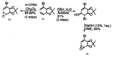 Depending upon the reagents used the reaction yields either species 14 or species 15. Epoxidation of cyclic alkenes is stereoselective, reaction will take place on the less hindered face. As seen in literature if a bulky reagent is used [mCPBA] the epoxide [species14] is formed. This is as a result of steric clash between the dioxolane group present on the molecule. The reaction is forced at the opposite face and as such the newly formed epoxide is "pointing down" while the dioxolane group stays "pointing up" from the plane of the ring. However the reaction may be directed to the more hindered face using the reaction scheme seen in the literature. In other cases, attack on the more hindered face may take place as a result of hydrogen bonding, perhaps if a hydroxyl substituent is present. This is exactly what we see in the synthesis of species 15. In order to direct reaction at the more hindered face; DBH/water is firstly used in order to add a hydroxyl group to the aromatic ring. With hydrogen bonding directing the subsequent attack, reaction at the more hindered face takes place giving rise to species 15 which has the dioxolane and the epoxide on the same face.