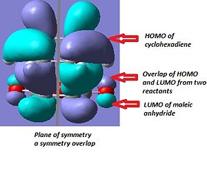 From the illustration in the table above, we can conclude the HOMO of cyclohexadiene overlap with LUMO of maleic anhydride for both endo and exo transition state. This is consistent with the face that oxygen atom is electronegative and lower the energy of maleic anhydrous compared to ethene. Therefore the cyclohexadiene is acting as electron donor.