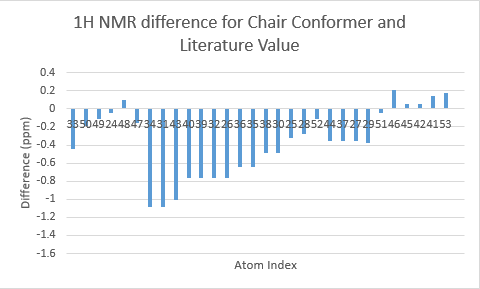 An interesting observation from all the NMR calculations performed is the apparent bias for computed carbon NMR data to be smaller than literature value (most of the orange bars are in the first quadrant) while for the proton NMR the computed values are systematically bigger than literature values, resulting in most of the blue bars to be in the fourth quadrant. A brief survey of the literature yields no plausible explanation as to where possible parametrisation within the calculation results in this bias. The lack of such information seems to suggest this has not been observed in calculations performed by others.