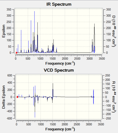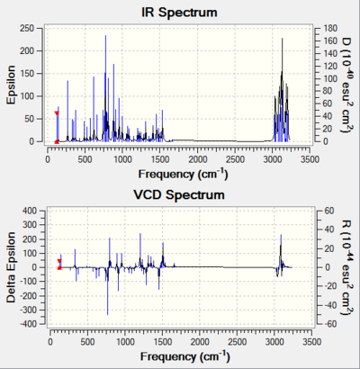 In this section, the Vibrational Circular Dichroism (VCD) is presented along with the IR spectrum. VCD provides 3D structural information about a molecule as it can detect the relative orientation of groups in the molecule, meaning chirality can be deduced from VCD. For two separate chiral molecules, the VCD spectra should be exact opposite of one another.