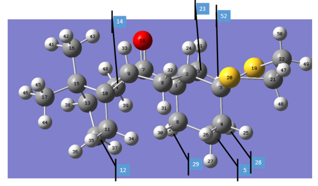 Cis R-(+)-pulegone oxide is suitable candidate to undergo the computational investigation above. It has a CAS registry number of 7599-91-9 and a molecular weight of 168.236 g/mol. The alkene precursor (R)-(+)-pulegone is readily available in the Sigma Aldrich catalog, with a CAS number of 89-82-7, and successful epoxidation process has been recorded in the literature [18]. The optical property measured in ethanol at 25 °C and 324 nm wavelength light is reported as 853.9°.[19]