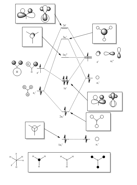 The degenerate 2e’ orbitals strongly resemble the suggested LCAOs, and the s orbitals of two hydrogen atoms interacting out-of-phase with the p orbitals of the boron atom can clearly be seen in both. These close out-of-phase interactions make them strongly anti-bonding orbitals.