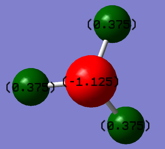 In the images below, red represents negative charge, and green represents positive charge. All representations are shown with very light green indicated a charge of 0.8 and very light red indicating a charge of - 0.8. Charges of lower magnitude appear darker.