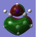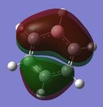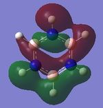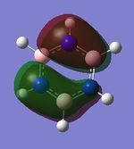 Finally, in this series of MOs being compared, the borazine MOs appear to be similar to the benzene MOs. The borazine MOs are not polarised significantly (unlike pyridinium and boratabenzene), and appear to be similar to the benzene MOs. This could perhaps be attributed to the inherent symmetry of borazine and benzene; this is in contrast to boratabenzene and pyridinium (in which symmetry breaking is observedm resulting in ensuing polarisation of the MOs).