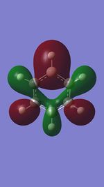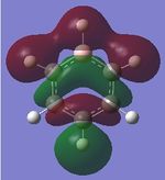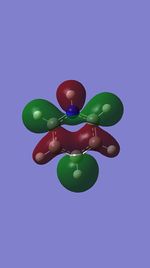 Boratabenzene and pyridinium, in contrast to benzene, have polarised MOs, perhaps owing to the loss of symmetry (with the concomitant change in electron density of the resulting boratabenzene and pyridinium molecules, as suggested in the NBO bond analysis above). However, boratabenzene and pyridinium are polarised 'oppositely' - the largest contribution in boratabenzene resides at a region surrounding the B atom, while the largest contribution in pyridinium resides para- to the N atom substituent in pyridinium. It can be suggested that the electropositive 'end' of the molecule has the greatest contribution to the resulting MO; and the MO is hence polarised towards these electropositive 'sites'. This can be rationalised due to the discernible anti-bonding character of the MO, which also contains 3 nodes (in all of the 4 MOs presented in this section). The relatively electropositive B (in boratabenzene) and C (in pyridinium) atoms hence are higher in energy as AOs, and make a greater contribution to the MOs observed. As such, rotating either the pyridinium or boratabenzene MOs by 180 degrees will show that these two MOs share a great resemblance. Meanwhile, borazine's MO has a greater resemblance to benzene; however, surprisingly, borazine's MO is not perfectly symmetrical (unlike benzene). This is likely due to quantum effects; electronegativity arguments and the relative energies of the AOs are unlikely to be sufficient arguments which can rationalise this slight loss of symmetry in the MO of borazine. Nevertheless, it is reasonable to assert that this surprising shape of the borazine MO is due to the B-N bonds (in contrast to the C-C bonds in benzene); the perturbations and changes in the corresponding AOs which form the MOs could have resulted in the unsymmetrical MO for borazine. Another possible reason could be that the "top half" of the borazine ring involves 2 B atoms and 1 N atom, while the "bottom half" of the borazine ring consists of 2 N atoms and 1 B atom. This is in contrast to benzene, in which the top and bottom halves are identical (with 3 C atoms on the top and bottom face of benzene).