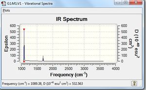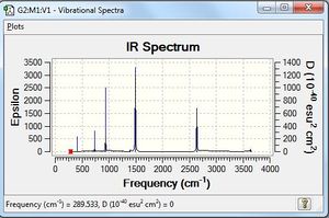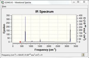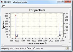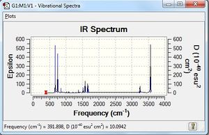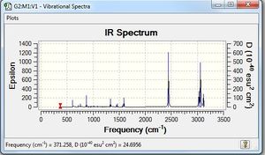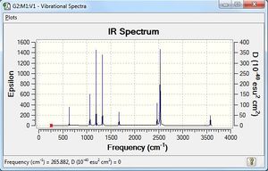 While 6 vibrations are observed in the animation, the simulated IR spectrum only shows 3 vibrational peaks. The bond stretching at 2583 cm-1 does not result in any change in the dipole moment; hence, it is not IR-active. In addition, two sets of degenerate vibrations are seen - the bending motion at 1213 cm-1 has two degenerate bends, while the 2716 cm-1 peak involves two degenerate IR-active stretches. As there are two degenerate modes of E' symmetry, this reduces 4 potential bands to 2. There are hence 3 vibrational peaks observed in the simulated IR spectrum. However, the peak at 1213 cm-1 is of a very low intensity, and it is probable that this is not observable in an actual IR spectrum.