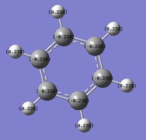 The charge distribution for benzene is easily rationalised, as the C atom is more electronegative than the H atom. The C-H bonds all would be expected to have the electron density in the bonding orbitals polarised towards the C atom. In addition, owing to the symmetry of the benzene molecule, all of the C and H atoms in the ring are equivalent (with identical calculated charge densities).