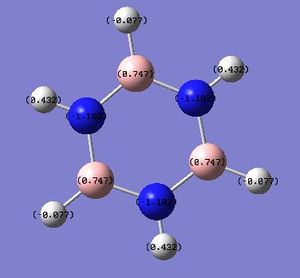 In borazine, the B atoms are positively-charged (+0.747) as expected, as they are bonded to the electronegative N atom (-1.102), with strong polarisation of the B-N bond. Similarly, the H atoms in the B-H bonds are negatively charged (-0.077) due to their greater electronegativity than B, while the H atoms in the N-H bonds are positively charged (+0.432) for the reverse reason. This suggests that significant ionic character in borazine's bonding could reduce the aromaticity-derived energetic stability of borazine. This suggests that unlike benzene, the charges in borazine are more localised (resonance delocalisation is less extensive in borazine, in contrast to benzene). The polarisation of the B-N bond is arguably a crucial factor which influences its reactivity - borazine is involved in electrophilic addition reactions, instead of merely participating in substitution reactions (as benzene does). This increased reactivity can be rationalised by invoking the strong polarisation of the B-N bond, which results in addition reactions occurring, at the expense of the energetic cost involved in the loss of aromaticity in the molecule. This suggests that the energetic stabilisation arising from aromaticity is smaller in borazine, in contrast to benzene. The NBO analysis has shown the polar B-N bonds which can be attacked by electrophiles; the regioselectivity of these addition reactions are high (also due to the polarity of these B-N bonds). NBO analysis is hence useful in understanding the surprising reactivity, and regioselectivity, of the aromatic borazine molecule.