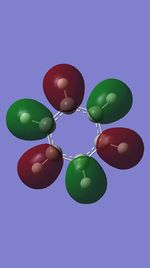 In conclusion, aromaticity hence involves the delocalisation of pi-electron density [4n+2 pi-electrons (n=1 for benzene)], and this MO analysis has suggested that our common depiction of fully in-phase 2p-orbitals is insufficient in describing aromaticity (it is just a MO which contains 2 electrons). The other 4 electrons should arise from the 2 degenerate e1g MOs with pi-symmetry. Aromaticity is hence a concept which goes beyond the over-simplistic depiction of fully in-phase pi-bonding p-orbitals; other MOs with pi-bonding character might have to be invoked and included, in order to rationalise aromaticity.