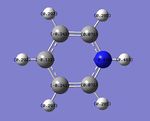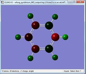 By utilising a colour range of -1 (red) to +1 (green), an image of the charge distribution of pyridinium is generated. Evidently, the electronegativity of N is evident; the N atom shows up as bright red.