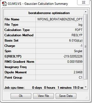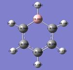 Boratabenzene involves the substitution of a "C-H" unit with a "B-H" unit, and this involves adding a negative charge to the molecule. With a reduction of symmetry observed (D6h to C2v), the C atoms are no longer calculated to have equal charge densities. The 2 C atoms directly adjacent to the electropositive B atom have the most negative charge densities, owing to the greater polarisation of the C-B bond, due to a greater difference in electronegativities. Similarly, the H atom bonded to B is negatively-charged (charge of -0.095), as the B atom is less electronegative than the H atom. It is interesting to note that among the 3 C atoms which are yet to be discussed, the 1 C atom which is para- to the B atom is the more negatively charged (-0.340), in contrast to the 2 C atoms which have a lower negative charge (-0.250). A simple consideration of inductive effects (i.e. proximity to the electropositive B atom) is hence insufficient; instead, drawing the resonance forms of the boratabenzene anion would show that the negative charge can lie on the C-2 and C-4 atoms, but not the C-3 atoms! The resonance diagram is as follows:
