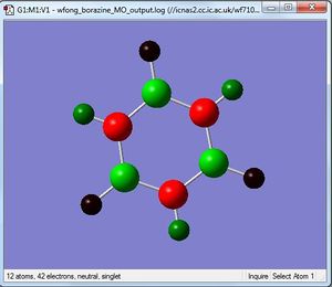 By utilising a colour range of -1 (red) to +1 (green), an image of the charge distribution of borazine is generated: