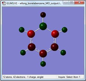 By utilising a colour range of -1 (red) to +1 (green), an image of the charge distribution of boratabenzene is generated. Evidently, the electropositivity of B is evident; the B atom shows up as bright green.