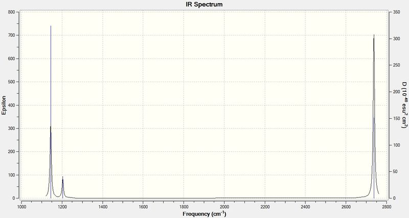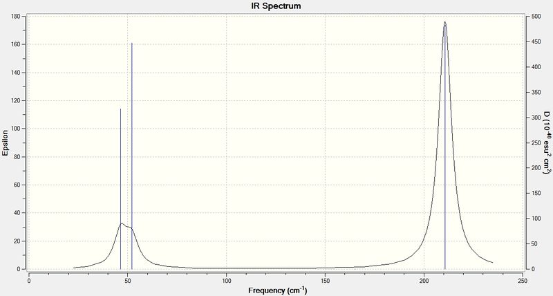 For the cis isomer, there are 4 peaks from both my calculation and the IR spectrum(literature). The frequency values for all the 4 peaks are close to those in literature, too. For the trans isomer, 4 peaks are found based on my calculation but only 2 of them are observed on the IR spectrum. This is because 2 of the vibration modes don't lead to an overall change in dipole moment of the molecule, rendering them IR inactive. The frequency values for the 2 peaks which can be seen on the IR spectrum generally agree with those in literature.