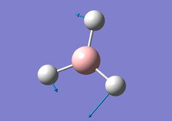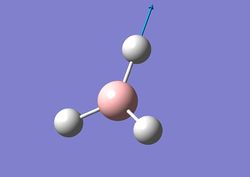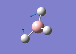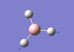 | 6 | Two H atoms move to and away from B at the same time while the 3rd H does the opposite(moves away from and then to B). Again the B atom moves with a very small amplitude. | 2737 | 104 | E' | 2616 |
