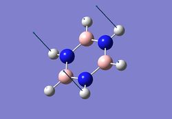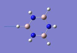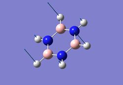 For the optimised structure of B3N3H6, the B-H, N-H and N-B bond lengths are 1.19A, 1.01A and 1.43A respectively. These are close to the literature values[9] where B-H bond length = 1.26A, N-H bond length = 1.05A and N-B bond length = 1.44A. The bond angles from calculation(122.90, 117.10) generally agrees with those found in literature, which are 120.00 in both situation.