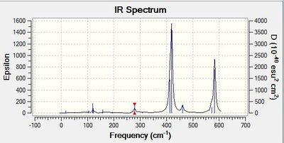 The results show there are six vibrations. As with borane, only three peaks are observed on the IR spectrum. The bends corresponding to the scissoring and wagging modes at 76 and 100 cm-1 respectively result in a change in dipole moment as they are antisymmetric. The third peak arises due to the antisymmetric stretches of frequency 316 cm-1. The symmetric stretch corresponding to a frequency of 197 cm-1 does not result in a change of dipole moment thus is IR inactive. The two degenerate vibrations at frequencies 76 and 316 cm-1 arise as one peak in the spectrum and thus, three peaks are observed.