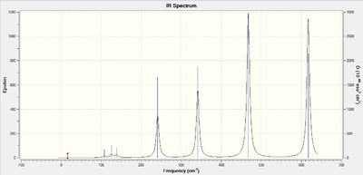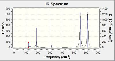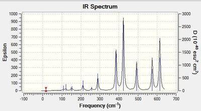 The IR spectrum does not show peaks corresponding to all of the eighteen calculated vibrations. 12 peaks are observed. This is due to the first five vibrations and the vibration corresponding to 186 cm-1 being IR inactive. These vibrations do not result in a change in dipole moment.