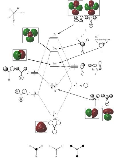 The computed molecular orbitals of three occupied molecular orbitals, 2a1’ and the two degenerate 1e’, show good agreement with molecular orbitals formed using the LCAO method. It can be seen from the computed molecular orbitals that the electron density is within the regions shown by the LCAO molecular orbitals. The LCAO 2a1’ molecular orbital shows the molecular orbital as consisting of localised 1s orbitals on the hydrogen and boron atoms with a greater contribution on the hydrogen. However, the computed 2a1’ shows the electron density spread over the whole molecule. Likewise the shape of the computed 1e’ do not correspond to localised 1s and 2p orbitals but show a shape that corresponds to an overlap of s and p orbitals. The computed non-bonding a2’’ molecular orbital looks like a pz orbital. However, the electron density is spread across the whole molecule with a nodal plane along the y axis rather than being localised at the boron atom. The 3a1’ shows electron density within the same regions of the molecule as that predicted by the LCAO 3a1’ molecular orbital. However, the orbital contributions are slightly different. There are greater contributions on the hydrogen atoms than is shown in the LCAO molecular orbital. The LCAO 3a1’ molecular orbital shows greater electron density on the boron atom than the hydrogen atoms however, the computed molecular orbital shows electron density is much more significant on the hydrogen than shown in the LCAO molecular orbital. It is difficult to assign the final two computed molecular orbitals to those of the remaining LCAO molecular orbitals. One of the LCAO 2e’ molecular orbital shows the electron density localised on boron and two of the hydrogen atoms whilst the other shows electron density on all three hydrogen atoms and the boron atom. The computed molecular orbitals show the electron density is spread across all three hydrogen atoms and the boron atom. Overall, there is a good agreement between computed molecular orbitals and those formed from LCAO approximations.