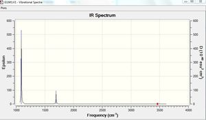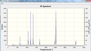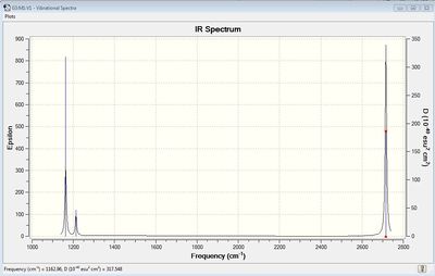 The results show there are six vibrations. However, only three peaks are observed in the IR spectrum. The vibrational mode of the molecule must result in a change in dipole moment in order for it to be IR active. The bends corresponding to frequencies of 1163 and 1213 cm-1 are antisymmetric thus, result in a change in dipole moment and are therefore IR active and two peaks are observed at the corresponding frequencies. The bend corresponding to the wagging mode has a greater intensity than the bend corresponding to the rocking modes at 1213 cm-1. The bends observed at 1213 cm-1 correspond to one peak on the computed IR spectrum. This is because the vibrations are degenerate. The third peak seen at a higher frequency of 2716 cm-1 arises due to antisymmetric stretches. The frequency of stretches is much higher than the frequency of the bends because................On the other hand, the symmetric stretch corresponding to a frequency 2583 cm-1 does not result in a change in dipole moment. Therefore, it is IR inactive and not observed on the spectrum.