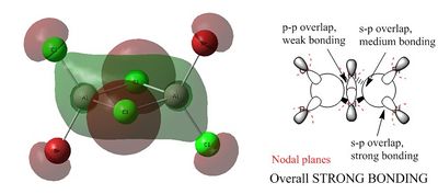 Bonding interactions (1) There is a through space, in phase, bonding interaction between the p like orbitals on the bridging and terminal Cl atoms. The distance of 3.59 angstroms is relatively large compared to the distance between the two bridging Cl atoms therefore, the bonding interaction is weak.